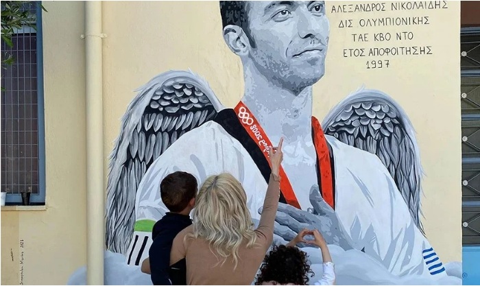 Γκράφιτι με φτερά αγγέλου, στον τοίχο του σχολείου που φοιτούσε στη Σταυρούπολη της Θεσσαλονίκης, έγινε ο σπουδαίος Ολυμπιονίκης τάε κβον ντο, Αλέξανδρος Νικολαΐδης έξι μήνες μετά τον θάνατο του.