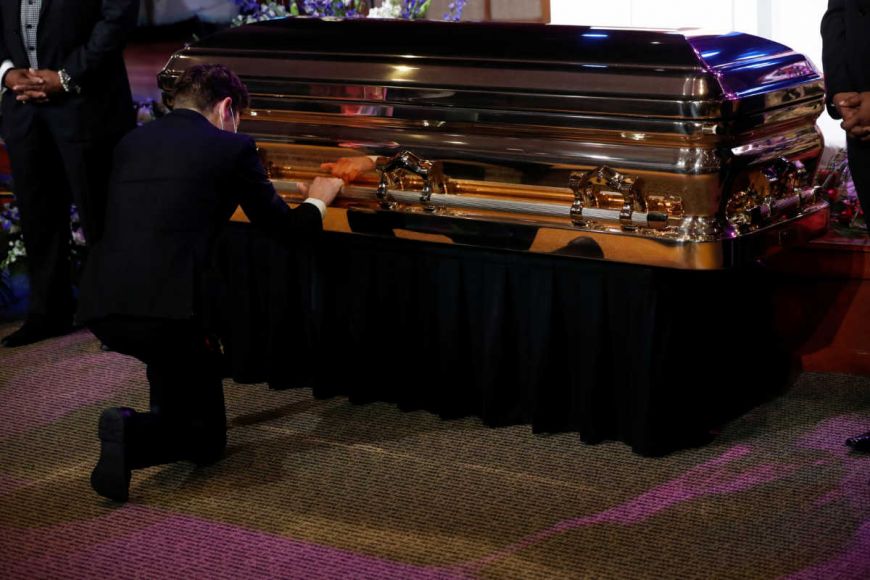 Συγκλονιστική και η στιγμή που ο δήμαρχος της Μινεάπολης, Τζέικομπ Φρέι, έφτασε στην τελετή και γονάτισε μπροστά στο φέρετρο του Τζορτζ Φλόιντ.