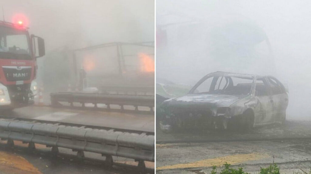 Οι δυο άνθρωποι που έχασαν τη ζωή τους επέβαιναν στο ΙΧ που βρισκόταν ακριβώς μπροστά στο κουβούκλιο των διοδίων όταν έπεσε επάνω τους το φορτηγό, μέσα σε συνθήκες πυκνής ομίχλης, για να τυλιχτούν αμέσως στις φλόγες.