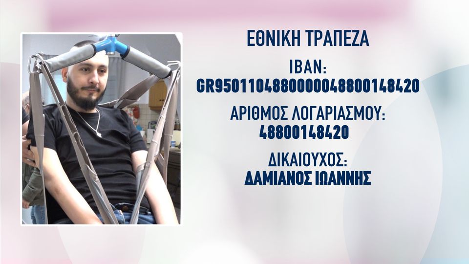 Ελάτε να δώσουμε όλοι μαζί ελπίδα στον Γιάννη και την οικογένεια του κάνοντας την αγάπη πράξη. Στόχος μας είναι να συγκεντρωθούν χρήματα για την δύσκολη καθημερινότητα και τις ανάγκες του Γιάννη αλλά και η προσφορά ενός αναβατόριου σκάλας. Ακόμα η οικογένεια του 26χρονου χρειάζεται πληροφορίες και από Έλληνες του εξωτερικού που να γνωρίζουν κάποιο κέντρο ειδικών θεραπειών προκειμένου ο Γιάννης να ακολουθήσει τις θεραπείες και να γίνει καλά.