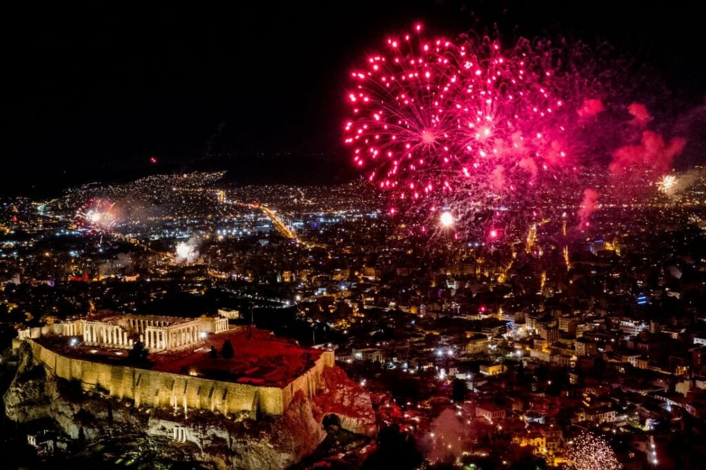 Ο ουρανός της Αττικής φωτίστηκε από τα πυροτεχνήματα και χρώματα έδωσαν μια νότα γιορτής στην άδεια πρωτεύουσα.