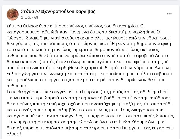 Με ένα συγκλονιστικό μήνυμα στο διαδίκτυο η χήρα του δολοφονημένου Γιώργου Καραϊβαζ τοποθετείται μετά την απόφαση του δικαστηρίου να αθωώσει, λόγω αμφιβολιών, τους δύο κατηγορούμενους για την δολοφονία του δημοσιογράφου.