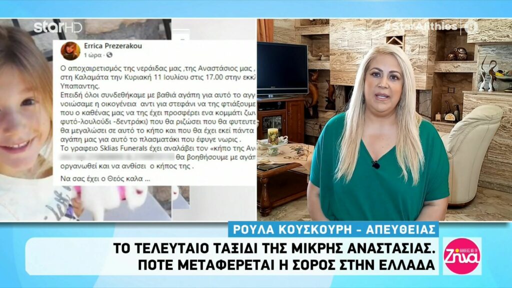 Την Πέμπτη αναμένεται να έρθει η σορός του μικρού αγγελουδιού στην Καλαμάτα, στο μέρος όπου μεγάλωσε και της έδωσε απλόχερα όλη της την αγάπη, σύμφωνα με το ρεπορτάζ της Ρούλας Κουσκουρή, στην εκπομπή Αλήθειες με τη Ζήνα.