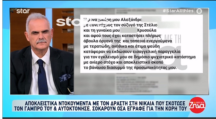 H εκπομπή Αλήθειες με τη Ζήνα αποκάλυψε αποκλειστικά αναρτήσεις του δράστη στο Facebook, στις οποίες κατηγορούσε ανοιχτά τον γαμπρό και την κόρη του για τον χωρισμό του και εξαπέλυε απειλές εναντίον τους, ενώ χαρακτήριζε την κόρη του ως «Κατάπτυστη, βδελυρή και διαβολική».